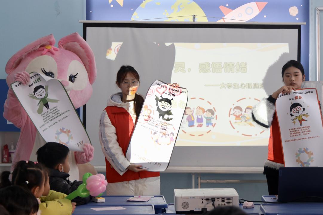 随后,大学生心理健康协会的志愿者为孩子们带来“拥抱心灵·感悟情绪”心理成长主题小课堂。结合生动案例与童趣化语言,志愿者们引导孩子们认识快乐、悲伤、愤怒、害怕等常见情绪,帮助他们理解情绪产生的原因与表现方式,学会做自己情绪的小主人。