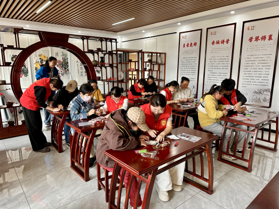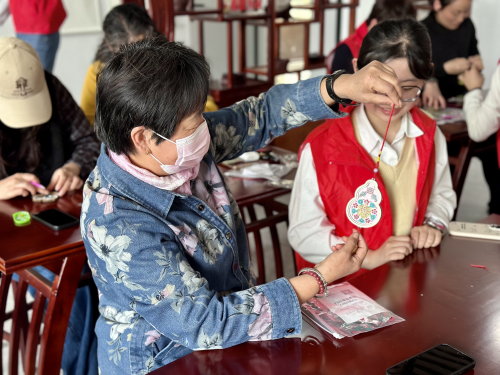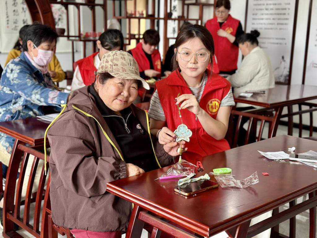 本次活动以“风铃寄思,编织传韵”为主题,大学生志愿者与社区爱“辛”妈妈们现场结对,耐心指导居民用彩线串起铃铛,搭配干花、纸鹤等装饰,共同制作风铃与编织物品。大家在动手实践中感悟节日内涵,共话邻里温情。
