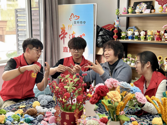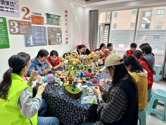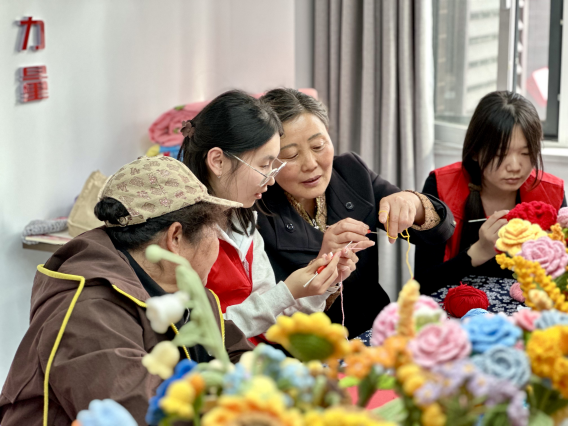 双方志愿者齐聚一堂,通过手工编织与经验交流增进了解、传递温暖。编织环节中,爱“辛”妈妈们手把手指导大学生学习基础技法,大家认真动手实践,彩线穿梭间,一件件饱含心意的手工编织品陆续成形。共同创作不仅分享了技艺乐趣,更拉近了两代人的心灵距离。