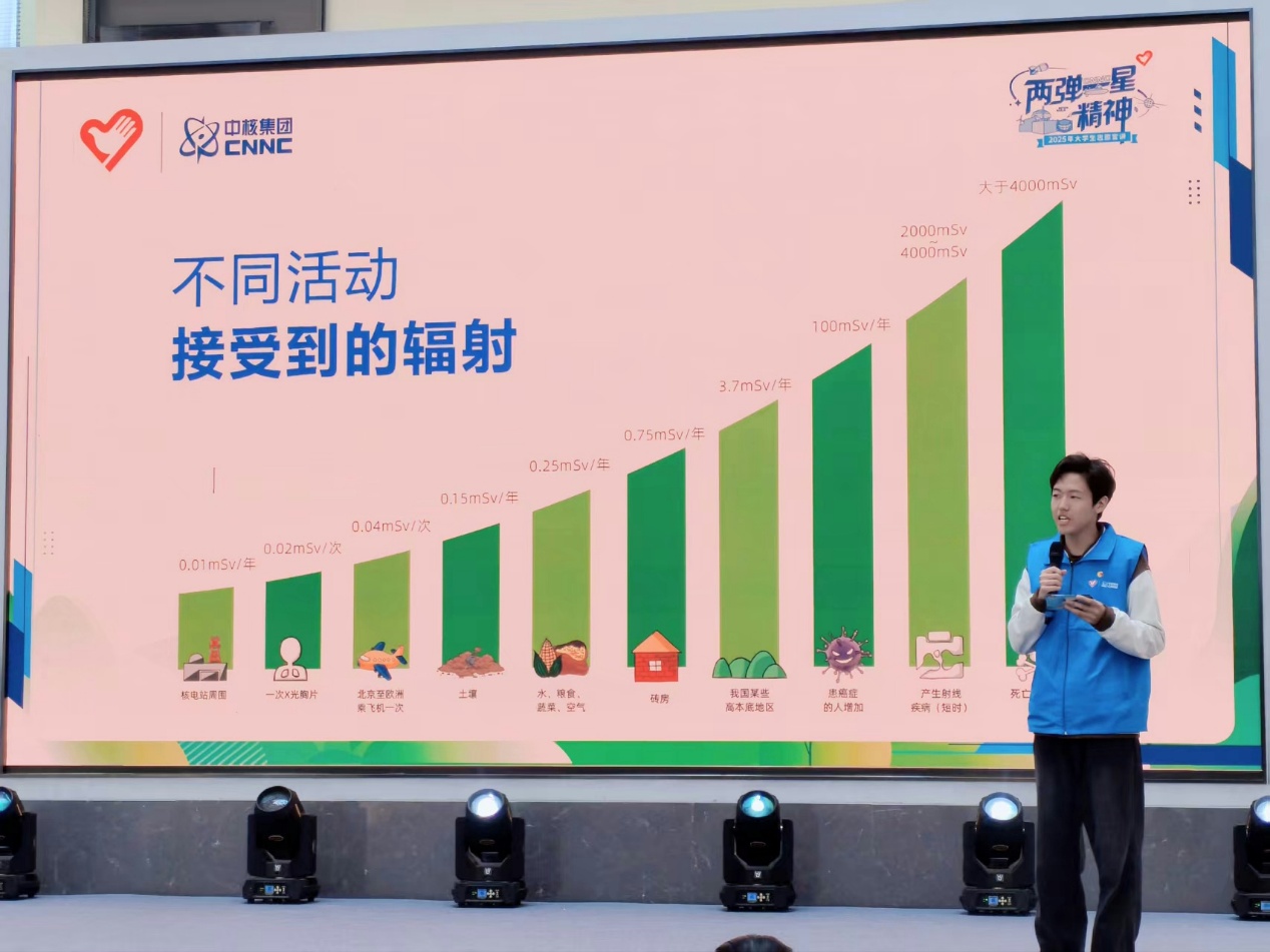 志愿者向市民们讲述了生活中的核辐射,通过精心准备的展板、图文并茂的讲解、珍贵的历史影像片段播放以及互动回答等多种形式,加强了人们对“两弹一星”精神的了解,增强了爱国精神。