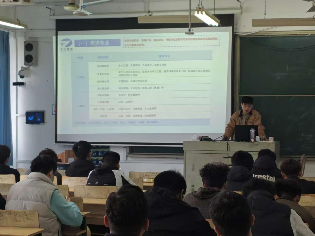 为进一步拓宽毕业生就业渠道,搭建优质校企合作平台,帮助学子精准对接企业,明确职业发展方向,11月1日上午,我院邀请天元集团、山东华铁航实业有限公司在理工楼2318举办专场招聘宣讲会。